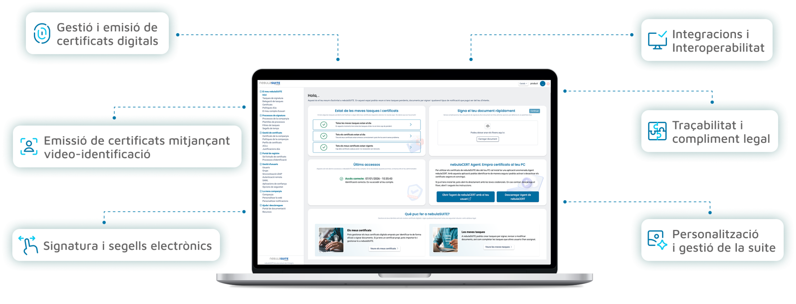 Amb nebulaSUITE, simplifiques la gestió dels teus certificats, signatures o segells digitals a la teva organització. Una única plataforma d’identitat digital per operar amb total seguretat, agilitat i control. Integral, adaptable i dissenyada per integrar-se fàcilment. Et permet escalar sense complicacions i complir els requisits legals més exigents.